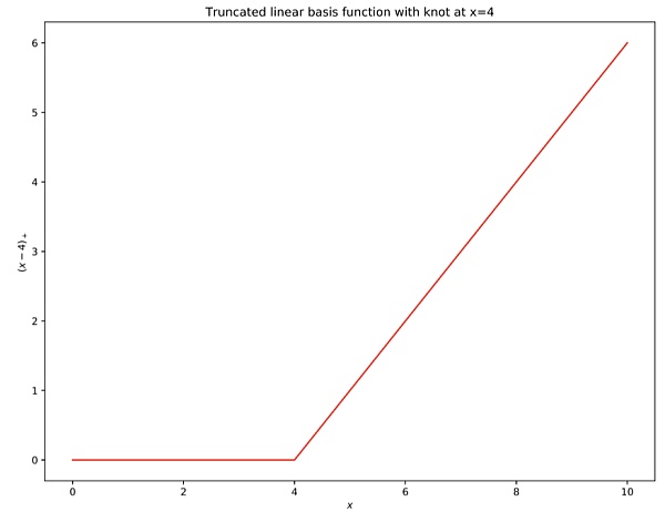 樣條的一個例子是下面的截斷線性函數。它在4的左邊是平的,稱為函數的結。
