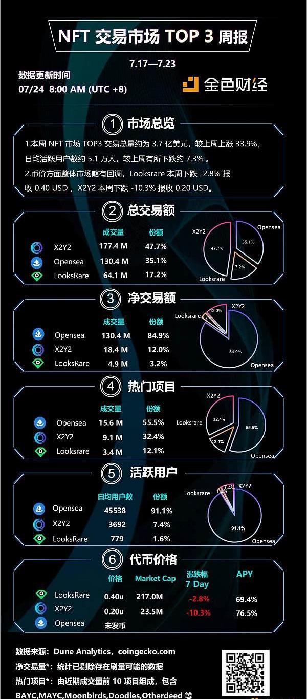 3、上周代幣市場表現較為疲軟,Looks下跌-2.8%報收0.40U,X2Y2下跌-10.3%報收0.20U。