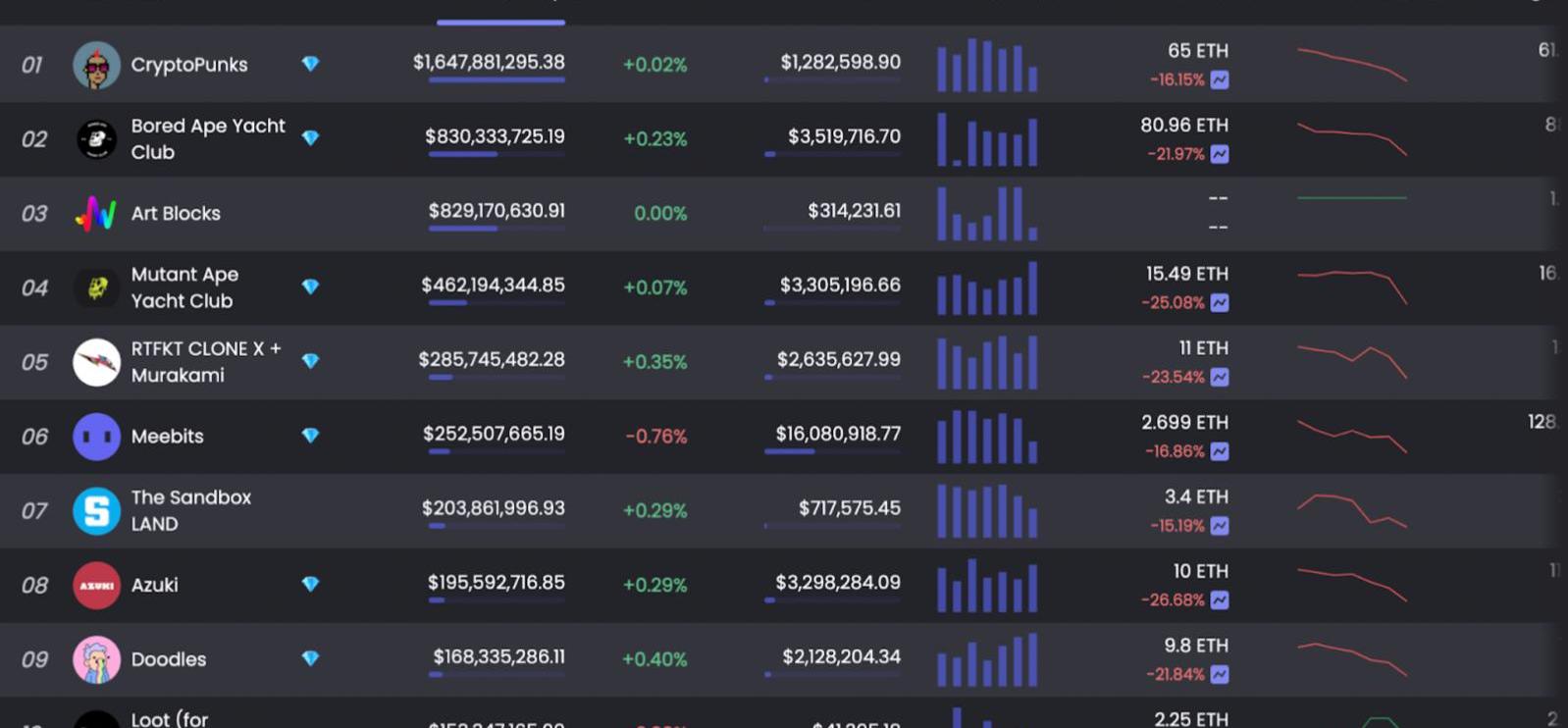 同樣的趨勢也出現在NFT市場中。在所有前10名的收藏品中,MAYC的跌幅最低,為2.83%,CryptoPunks的跌幅最高,超過16.29%。