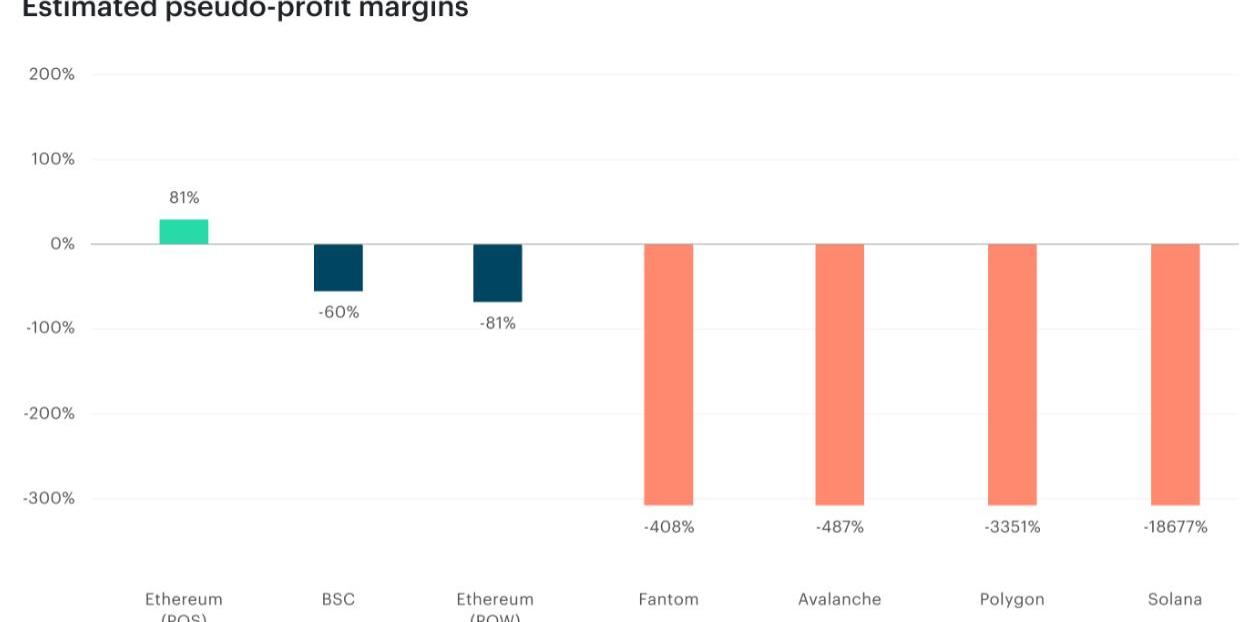 銷毀的代幣減去發行的代幣,可視為鏈的一種盈利形式。記住上述所有因素,我們可以看到,運行PoS的以太坊鏈估計有81%的假定利潤率(見圖6)。