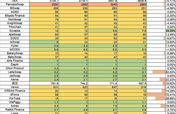 本周整體波動極小,TVL總量下降1.17B,下降幅度達1.5%。