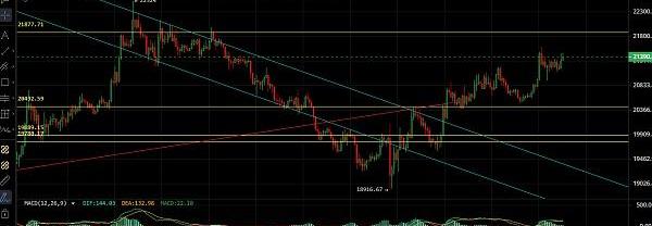 大餅昨日給出的多單非常完美,盤面整體呈先跌后漲走勢,低位回踩至20480一線未能破位,橫盤震蕩后向上反彈,高位觸及21600附近承壓回落,恭喜跟上昨日多單的朋友獲利1200點空間,四小時級別k線連陽上行,在布林帶中上軌運行,上下影線都挺長,多空都得不到延續,使行情陷入橫盤震蕩,但整體在ma均線上方運行,macd金叉狀態,目前明顯多頭占優,若突破21600壓制下個位置關注22500,后市思路依舊回踩低多為主,21000-20800多,目標21600-22000突破減倉持有,激進現價打底