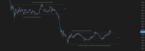 如上圖所示,即使對區間高點進行了四次重新測試,BTC價格也沒有重新測試區間低點,這表明買家現在比賣家更強大。