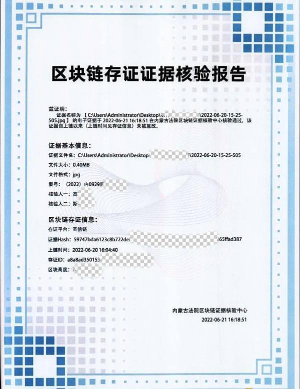 2022年6月22日,四子王旗人民法院民事庭利用“內蒙古法院區塊鏈證據核驗中心”平臺,使用區塊鏈存證技術審理了一起金融借款合同糾紛案件。