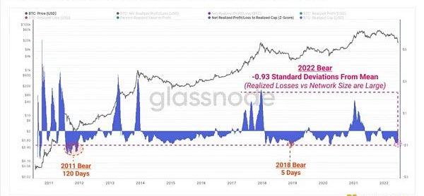 本文我們將用到許多指標,衡量比特幣和以太坊持有者的實際受損情況,確定最近的拋售事件和資本“投降事件”的嚴重程度,并與之前的周期進行比較。作為結論,我們認為?2022?年是數字資產歷史上最嚴重的熊市。
