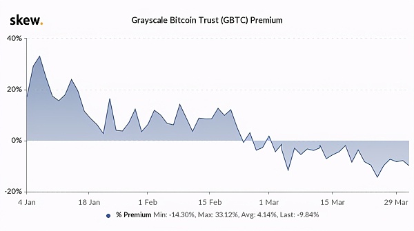 摩根士丹利根據其可能持有的GBTC股份,將基金溢價的波動視為其潛在的投資風險之一。“歷史上”的交易價格與比特幣的價格相比有溢價或折價,事實上研究公司Skew指出,三月份GBTC溢價變為負值,達到了大約-10%的歷史低點。