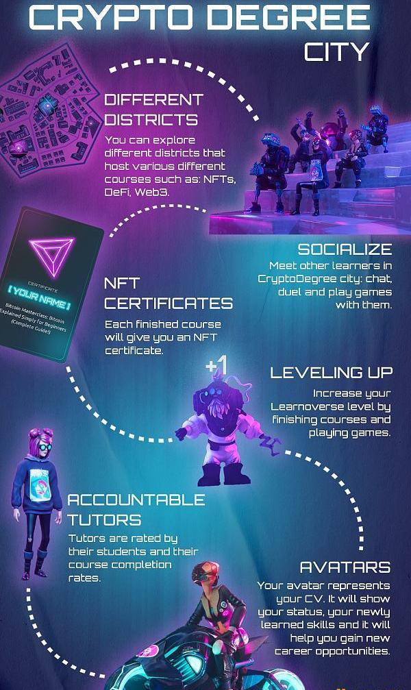 不過構建元宇宙不是一項簡單的任務,需要時間,所以Learnoverse計劃逐步從2D過渡到3D「CryptoDegreeCity」,而Learn&Earn代幣經濟學、Learndrops、NFT頭像、土地和建筑物將首先進行搭建。