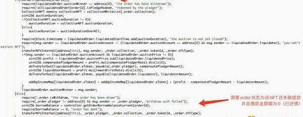 2.接著調用withdrawNFT函數提取出質押的NFT,其中首先判斷該訂單是否被清算狀態,如果不是則判斷該訂單的狀態是否為NFT還未被提取且借款金額為0,如果通過即可提取抵押的NFT。