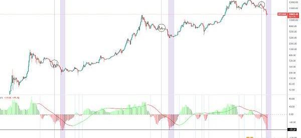 如圖所示為BTC周線走勢,我們看下方指數曲線一旦從高位回落一路跌至0軸然后跌破,對應BTC價格后面也將開啟瀑布行情,本輪跌破0軸BTC價格還在47000-48000區間,后面最低插針至17600再回升,前兩輪熊市跌破后的下殺力度也都較大,前期文章剛破位時已經提示過,同時可以發現下方紅色量柱已跌至黑線水平線位置,前期一旦跌至黑線區域基本對應BTC每輪熊市底部,目前這個位置不建議盲目殺跌,下方月線也觸碰到了黑線趨勢線,上一次觸碰還在2020年312,后面止跌回升站上下滑紅線,然后展開2020-2021牛市,再前兩次BTC低位回升重新站上下滑紅線,后面啟動2015-2017牛市和2019小牛,目前顯然還有距離,右側機會還需等待,底部醞釀也需要時間,前期均是數月之久,短期看仍處于反彈周期,短期壓力21800、23000。