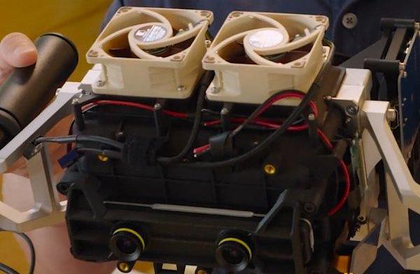 由于整個系統功率過高,團隊成員甚至直接安裝了兩枚裸露在外的散熱風扇,來給硬件設備散熱;甚至因為系統過重,根本沒法用常規方法戴在頭上,所以只能用兩個把手扶著。