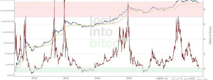 上圖的藍線代表比特幣的當前市值,橙線代表已實現的價格,紅線代表Z分數,這是一種“標準差測試,在數據中拉出市值和實現價值。”