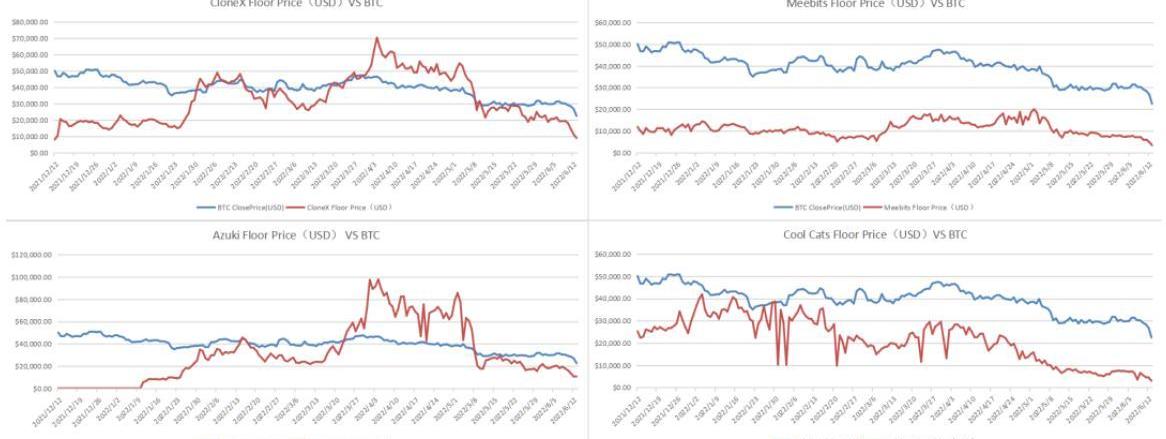 如此看來,美元本位的藍籌NFT在本輪熊市中具有兩個有趣的特點,一是部分藍籌會走出獨立行情對抗大盤走勢,但在之后會加速下跌,二是近期的一些藍籌NFT開始跟隨BTC走勢,并且放大了跌幅。