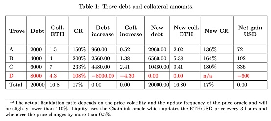 如下圖所示:此時Trove D的抵押率為108%觸發清算。由于穩定池LUSD不足,抵押品4.3個ETH和相應債務則會被分配到其他Trove頭上,Trove D的凈損失約7%(600/8600=7%)。抵押率越充足,則被分配到的抵押品及LUSD越多。Trove C被分配到最多的抵押品(7個ETH)及最多的債務(4480個LUSD)債務,其抵押率由233%降低至180%,其凈收益為$336。