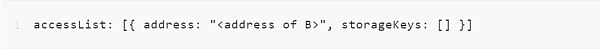 我們首先需要為在這條事務的訪問清單中加入這個地址支付 2400 gas,但對 B 使用的第一個操作碼就只需要消耗 100 gas 而不是 2600 gas,這就剩下了 100 gas。如果 B 也需要使用其存儲項,我們又知道它將使用哪個鍵,我們也可以把這些鍵包含在訪問列表中,然后為每個鍵的操作省下 100 或 200 gas(取決于第一個操作碼是 SLOAD 還是 SSTORE)。