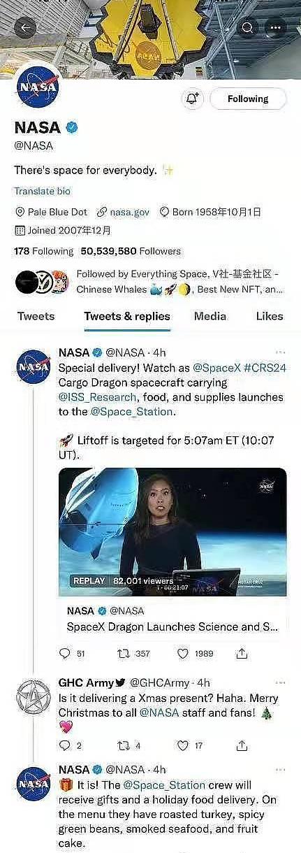 2、NASA多次點贊并回復GHC,NASA是美國國家航空航天局,擁有近5000萬推特粉絲。ElonMusk,SpaceX官推,賈斯丁比伯,巴黎希爾頓,Jack,孫宇晨等都有關注NASA的官方推特。相信NASA的點贊和回復,這些大佬都會有所關注GHC。