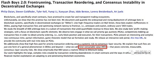 MEV是Miner Extractable Value,指的是礦工可提取價值。MEV最早由Philp Daian等人于2019年4月提出,并隨著DeFi的發展,逐漸被人們重視。