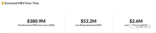 可以說,由于以太坊上交易的持續存在,MEV是一直都有的。因此,也很難準確計算出一共有多少MEV。不過通過歷史記錄,可以計算出已經實現的MEV。截止到藍狐筆記寫稿時,目前已實現的MEV超過3.8億美元,規模不小。