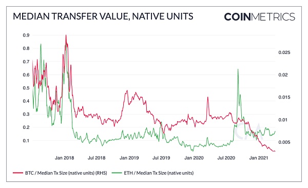自2020年夏季以來,以ETH計價的Ethereum網絡的中位數轉賬價值已經飆升,這可能是由于去中心化金融(DeFi)的興起。比特幣以BTC計價的中位數轉賬價值曾在2021年下降,因為價格已經上升。?