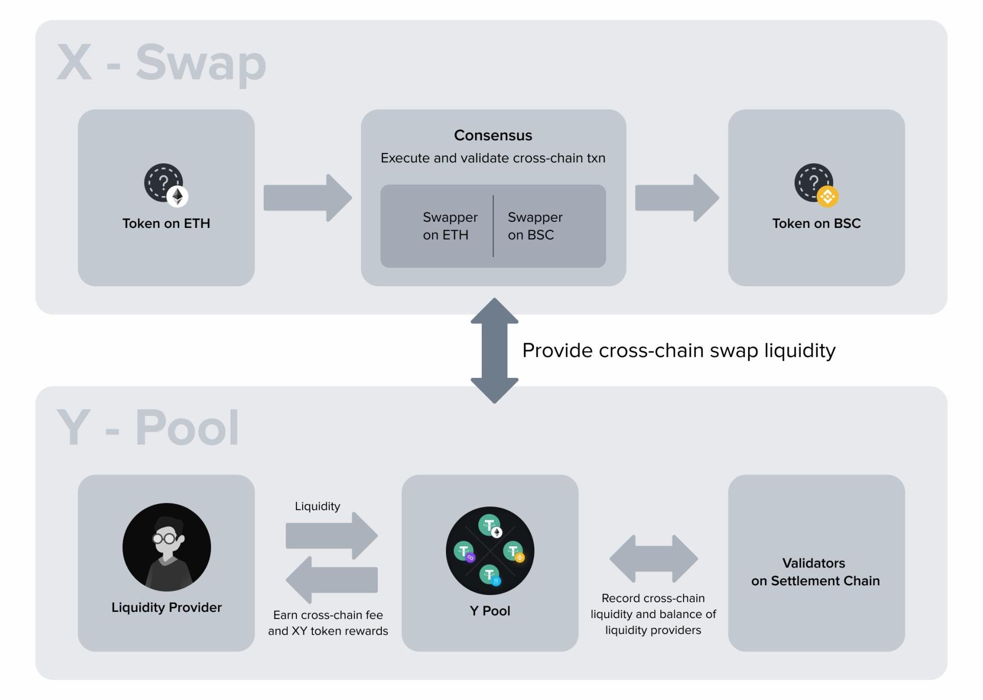 整個運轉流程如圖所示,XSwap執行并驗證跨鏈交易,YPool作為XSwap的支柱,LP通過其提供跨鏈Swap流動性,賺取跨鏈費用和XYtoken獎勵,結算鏈上的驗證者記錄跨鏈流動性和LP的余額。