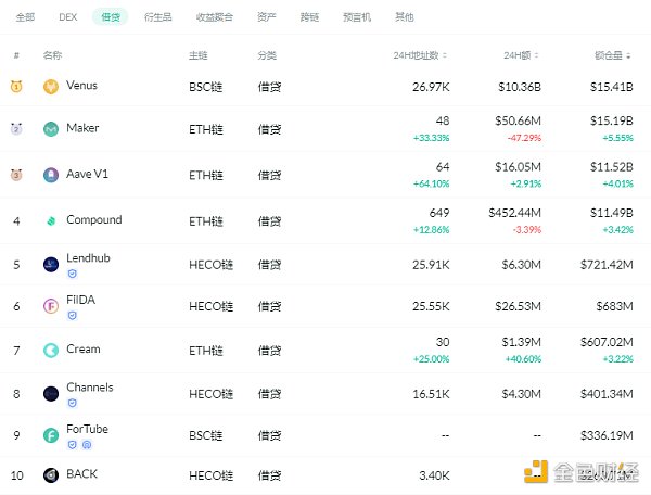 鎖倉量排名前十的借貸平臺 排名來源:DeFibox