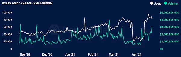 如上圖所示,去中心化交易所的交易量在2月底激增,隨后在4月第一周出現下降趨勢,所有DEX的總交易量在4月4日降到了6.03億美元。