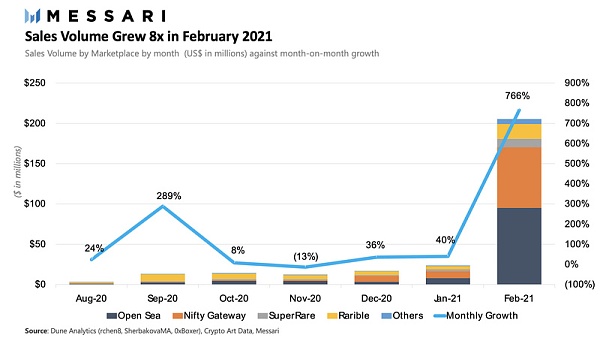 據一份針對1-3月份的統計,5個最受歡迎的 NFT 市場 (NBA TopShot、 OpenSea、CryptoPunks、rare、SuperRare) 過去 30 天的交易量達到了 4.2 億美元,2月份的總銷售額相比1月增長了接近8倍。