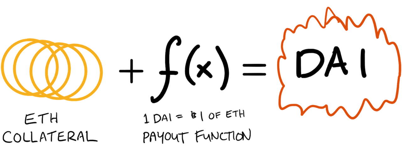 總結一下:擔保品與一個支付函數相結合,就創造了一種合成資產。舉個例子,MakerDAO 創造的 DAI 可以歸結為:
