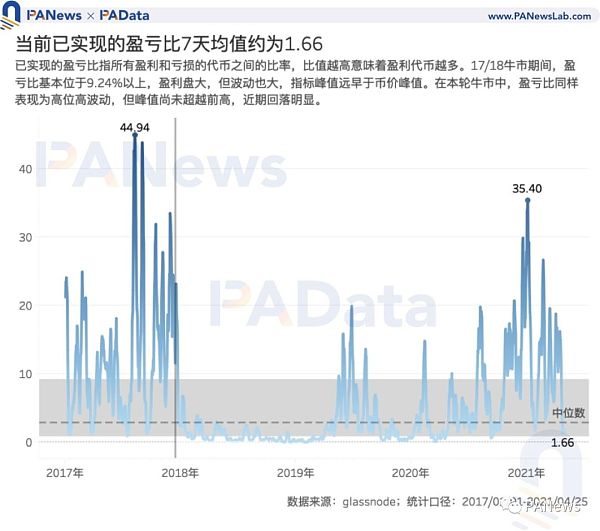 牛市行情的主要表征之一就是大多人籌碼能夠盈利。根據BTC在鏈上移動時的價格與當前價格相比的盈虧狀態,可以得出實現利潤/實現虧損比率,比值大于1,則盈利籌碼多于虧損籌碼,比值越高,盈利籌碼越多;反之則盈利籌碼少于虧損籌碼。盈利籌碼積累到一定的程度會產生獲利需求,進而產生拋壓,影響幣價。?