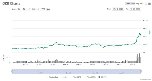 OKB 的價格從 12 月末的 $2.5 最高上漲至 $7.1,漲幅近 2 倍,同時 OKB 不斷突破新高,較 2019 年最高點上漲 87%,是三家主流平臺幣中近期市場表現最好的。