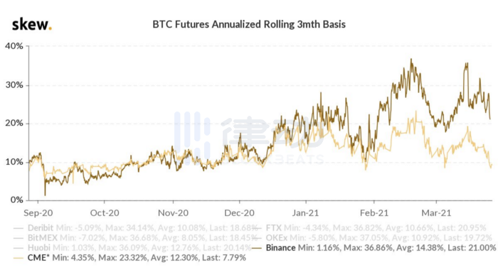 此圖顯示了過去幾個月的 BTC 滾動基差。在牛市階段,該基差已遠高于 30%。