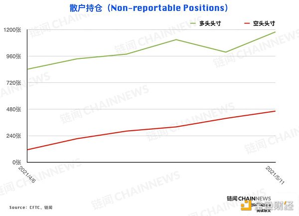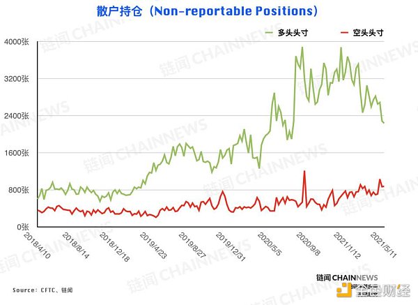 散戶持倉方面,多頭頭寸自 2286 張下降至 2237 張,空頭頭寸自 868 張小幅上漲至 876 張。散戶比較意外地在市場價格波動幅度有限的情況下進行了清晰的凈空調倉,在大型機構未能準確預判最新統計周期結束后的一輪回調的情況下做出了相當正確的判斷,這可以認為是最新一期周報中最大的意外之喜。