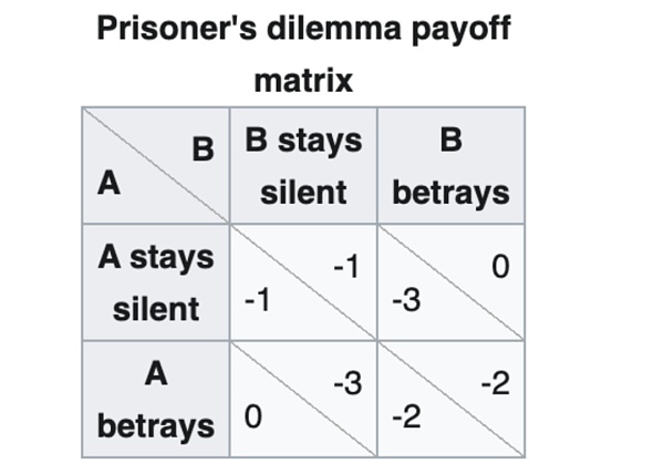 因為背叛伙伴比與他們合作提供更大的回報,所有純粹理性的自利的囚犯都會背叛對方,這意味著兩個純粹理性的囚犯唯一可能的結果是他們互相背叛。