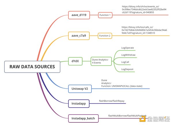 總體方法概括如圖中所示,Aave直接為用戶提供封裝好的閃電貸函數,通過閃電貸函數調用情況追蹤閃電貸交易哈希;dYdX則是基于四個事件日志獲得交易哈希;Uniswap V2的閃電貸鏈上交易數據通過Dune Analytics的UNISWAPV2CALL確定交易哈希;Instadapp的交易數據獲得方式與Aave一致,通過其閃電貸函數調用情況追蹤獲得。