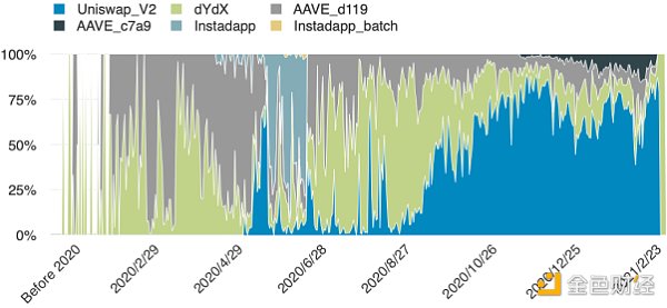第二輪爆發發生于去年10月,由uniswap V2推動,同時從當月起閃電貸攻擊進入高發期。且在Uniswap V2上發生的閃電貸交易比例一直維持在60%左右,甚至最高曾接近90%。但在Aave V2上線之后,Aave V2瓜分了部分閃電貸交易市場。目前閃電貸市場交易頻次穩定在Uniswap V2占七成,Aave占二成,dYdX一成。