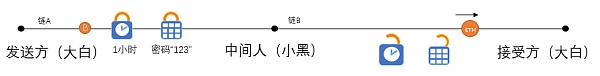 這個過程相當于,小黑自己也上了兩把鎖,其中哈希鎖和大白的那把哈希鎖一樣,需要用同樣的密碼才可以打開,時間鎖假如為半個小時。
