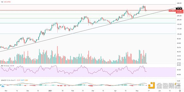 跟隨大盤強勢調整,不過未破下方長期趨勢線,多頭趨勢并未改變,前期一樣有多次大幅度的調整,中長線可以耐心持幣,調整反而給了低吸的機會,趨勢支撐250美金,回落中長線可以分批低吸,牛市未完,短線可以逢反彈減倉,壓力345美金。