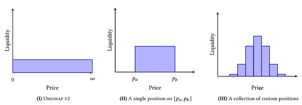 V3對TVL的依賴性要小得多,因為它允許流動性提供者在指定的價格范圍內建立多個頭寸。因此,在市場價格附近集中流動性的概念取代了"無限 "流動性的概念。