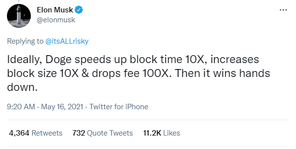 5 月 16 日,馬斯克對于比特幣的態度出現了明顯的變化。他在推特上進行了頻繁的發言,先是稱正在與狗狗幣開發者合作,希望理想情況下,可以將狗狗幣區塊時間加快至 10 倍,將區塊大小增加至 10 倍,并將手續費用降低至 1/100。