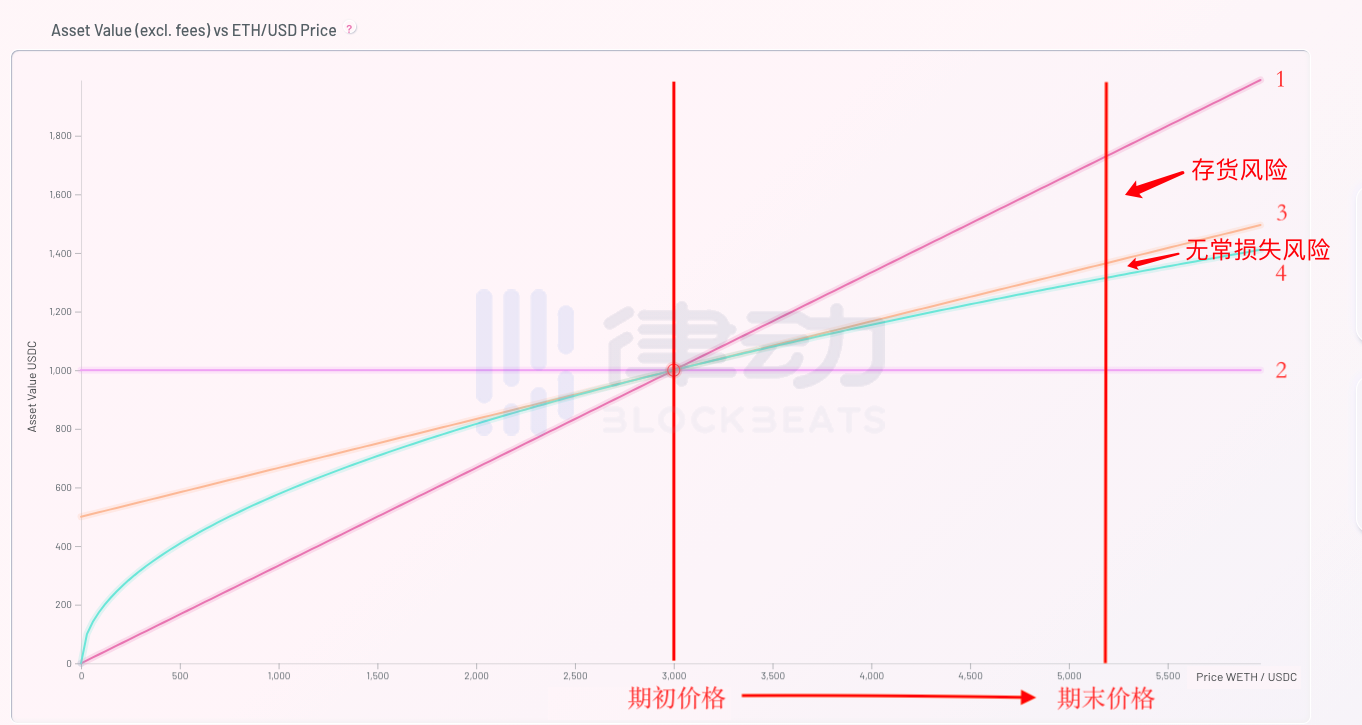 讓我們重新回到投資者的視角。假設投資者 A 預期未來 ETH 的價格上漲,那么如果其在期初購買了「LP Position」基金,在 ETH 價格真的發生上漲時,投資者 A 將會承擔哪些風險?