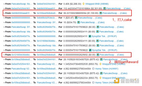 黑客首先向hunnyMinter合約中打入了56個cake代幣;再同時調用CakeFilpValut合約中的getReward函數,間接觸發了hunnyMinter中的mintFor函數。