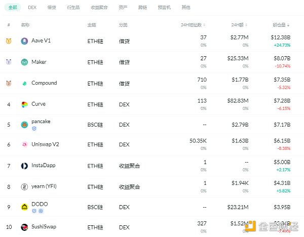 DeFi項目鎖定資產前十排名及鎖倉量,數據來源:Debank