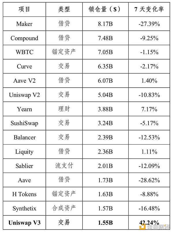 表 1 中分別列出了當前主要 DeFi 項目的鎖倉量和近 7 天的鎖倉量變化率。從表中可以看出,Uniswap V3 的鎖倉量約為 15.5 億美元,在 DeFi 項目中排名第 15 位。考慮到 Uniswap V3 的上線時間還不足一個月,這已經是一個不錯的成績。從近 7 天的鎖倉量變化率的角度來看,Uniswap V3 的表現要比其他 DeFi 項目好很多。由于近期加密貨幣市場大幅下跌,很多 DeFi 項目的鎖倉量發生銳減,但 Uniswap V3 的鎖倉量在這期間逆勢增長了 40% 多,這體現出很多流動性提供者(LP)非常看好 Uniswap V3,并且實際提供了大量流動性。