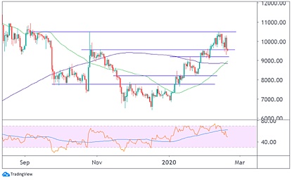 比特幣在2月13日創造了$10510(OKEX BTC指數價格)的近期最高點,隨后開啟下跌走勢。經過三輪下跌,并在向下測試前期支撐位$9550附近后止跌,最終并未直接打穿該區域,短線開始反彈。在本周末有很多交易者心跌破幣價直接$9550,使得出現中期的趨勢反轉,不過該支撐位最終守住。而在隨后幣價反彈突破$9800后,交易量放大,并在周二晚間再次測試前期密集成交區$10200至$10300,許多交易者希望看到幣價能夠回補CME期貨在周末留下的缺口,該缺口上方至$10,460。但在2月20日凌晨,比特幣的放量下跌使得希望落空。