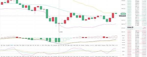 比特幣昨日上漲力度不大,而以太坊一路暴漲,突破歷史新高,比特幣一直在31500-33300附近震蕩運行,現比特幣在33450附近運行,技術指標來看,比特幣在中軌上行附近運行,布林帶微微縮口向上運行,附圖指標MACD紅色能量柱逐步放量,快慢線在0軸上方向上運行,KDJ三線向上拐頭,午間建議做多為主