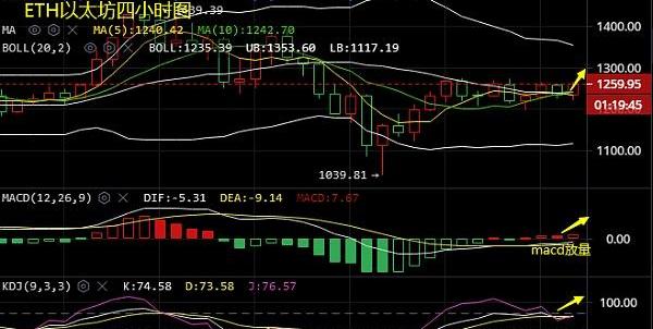 1h級別圖看,boll下軌向上抬頭,中軌明顯向上運行,幣價有所企穩,KDJ多頭向上運行,MACD紅色能量柱逐步放量,短期的行情多頭還是比較明顯,操作上天賢建議順勢低多進場.