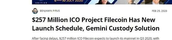 區塊鏈媒體《Cointelegraph》在其官網發文《2.57億美元的ICO項目Filecoin具有新的啟動時間表,雙子座托管解決方案》