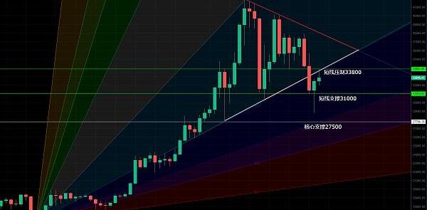 今日關注各周期趨勢圖的時候,隨后拉出一根江恩角度線,發現2/1主射線正是當前的逐漸向上移動的上行趨勢線,隨著時間的推移,昨日的高點已再次出現抬升,今日需關注該射線的壓制效果,合約用戶仍然采用高空低多的建倉思路,在該區域建立空單,目標同樣看向800-1000點,低點方面給出卻不一定能夠激活,建議在31000-30800區域做多,目標上看500-700點。下方核心支撐則是在3/1射線27500附近,不過該區域同樣會隨著時間的推移向上逐步延伸。