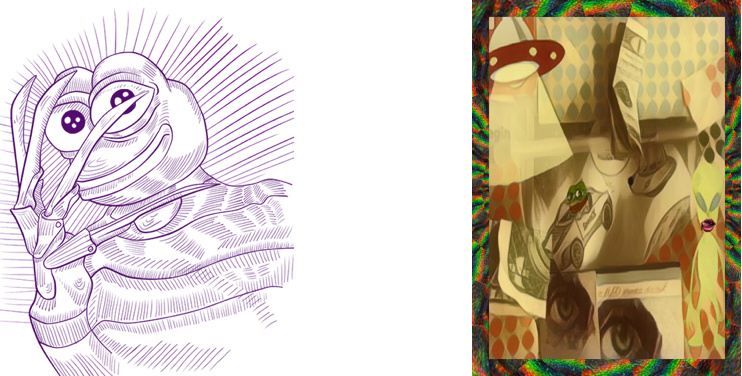 就概念和形式而言RarePepe更接近于現在的NFT藝術品,網站上有各種不同風格的Pepe原創作品,發展出了MEME和各種藝術風格融合的加密藝術品,波普、迷幻、古典、抽象等等。