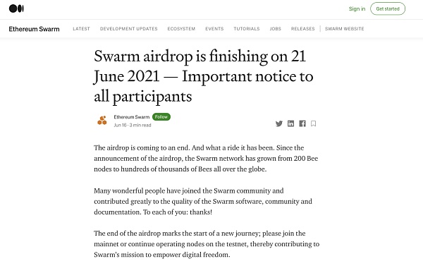 XRP/HKD-4.79%突發消息:Swarm官方宣布“6月21 日空投即將結束。這真是一段旅程。自空投宣布以來,Swarm 網絡已經從 200 個 Bee 節點發展到全球數十萬個 Bee,8月2號開啟質押運行主網節點”。