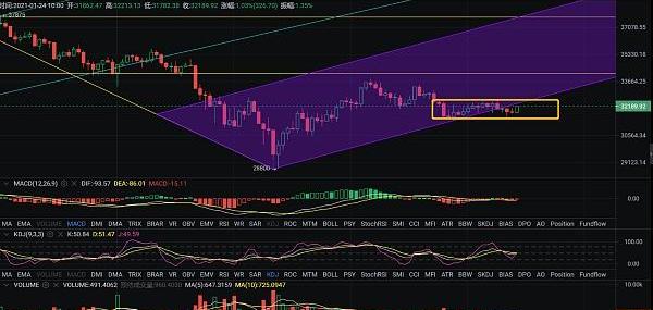 從盤面我們可以看到,昨晚的幣價波動居然沒有超過一千點,一直在32500-31500區間內震蕩,感覺很有意思,自從牛市開啟之后幣價在晚間還沒有如此的這么平靜過,早上起來我都有點看不懂這個行情了。仔細回想了一下這幾天的行情,幣價漲不上去,跌不下來的,似乎是主力資本強行拉盤,防止下跌,但這種解釋只是一種猜想,反觀市場的情緒從起初的期待到恐懼到現在的持空倉觀望,K線充分的展出了大家的內心世界。